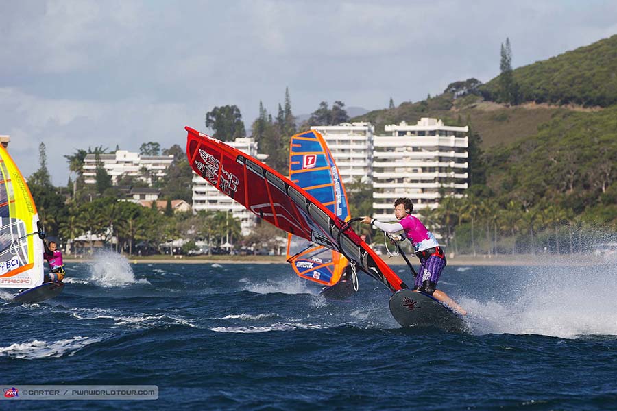 The wind continued to blow on day four of the Airwaves Noumea Dream Cup PWA to produce another action packed day in New Caledonia, as a further three races for the men and four races for the women were completed in 15-25 knot winds. By the end of the day Ben Van Der Steen (Tabou / GA Sails / Mystic) headed to the top of the rankings after a near perfect display, which saw the flying Dutchman win two races and claim second in the other. Meanwhile, Antoine Albeau (RRD / NeilPryde), edged into the lead in the battle for the 2014 title as he took his second bullet of the week in the final elimination of the day, whilst Delphine Cousin (Starboard / Loft Sails) edged ever closer to the world title after securing two more victories today.Men’s – Elimination Four – Winners’ Final
