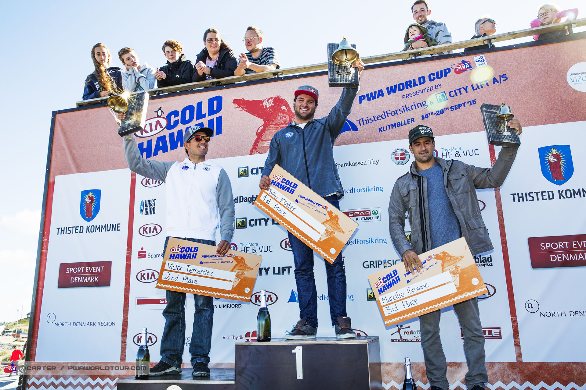 Philip Köster (Starboard / Severne / Maui Ultra Fins) gewinnt den diesjährigen KIA Cold Hawaii PWA World Cup, der zweimalige Weltmeister blieb bei der diesjährigen Veranstaltung ungeschlagen. Der 21 Jahre alte Köster schlug Marcilio Browne (Goya Windsurf / MFC) in der Single Elimination, bevor er den stark fahrenden Victor Fernandez (Fanatic / North / MFC) im hart umkämpften Finale der Double schlug. Auf dem Weg zum Sieg verbuchte Köster einen perfekten 10 Punkt Wellenritt, zudem landete er zahlreiche Double-forwards – sein Markenzeichen. Dies war der zweite Sieg Kösters in Cold Hawaii - nachdem hier im Jahr 2011 gewonnen hat. Mit seinem jüngsten Erfolg setzt er sich ganz knapp an die Spitze der Gesamtwertung, vor Victor Fernandez. Victor Fernandez war der einzige andere Starter der einen perfekten 10 Punkte wellenritt hinlegte, aber er konnte die Double Elimination trotz eines Superfinales nicht für sich entschieden. Fernandez nimmt den zweiten Platz in Dänemark nach Hause, der Weltmeister von 2010 liegt nach drei Veranstaltungen punktgleich mit Philip Köster.