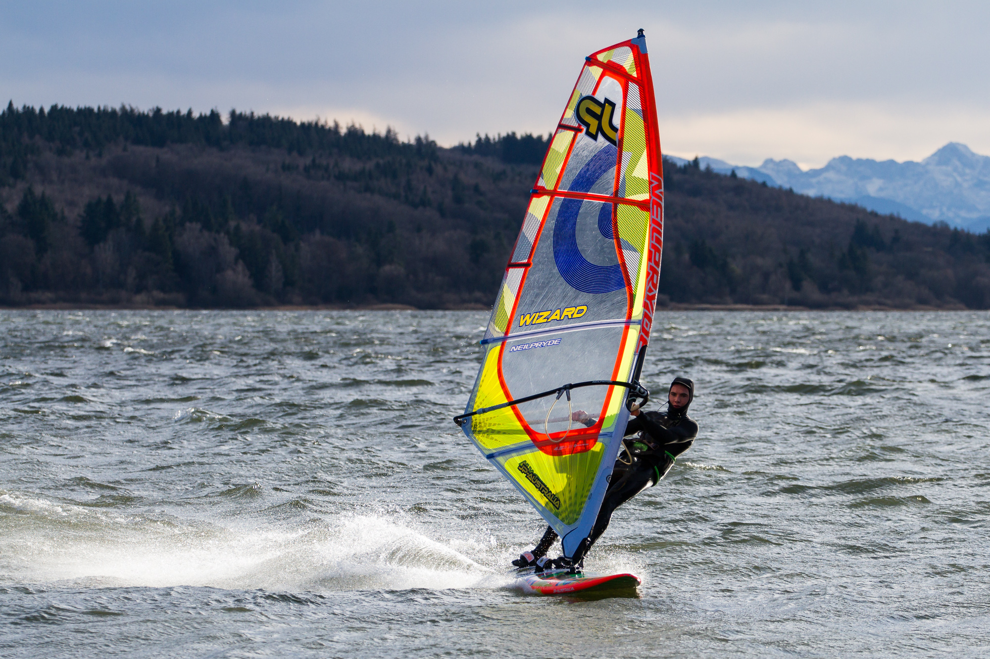 Tolle Saisoneröffnung für mich - anfangs gut Druck im Segel und relativ konstant. Irgendwie verlernst das Surfen halt nicht - nauf g´stellt und ab ging´s. Nach einer Stunde dann Sonne genossen und schneebedeckte Berge