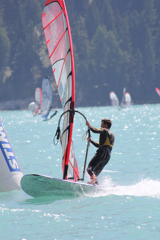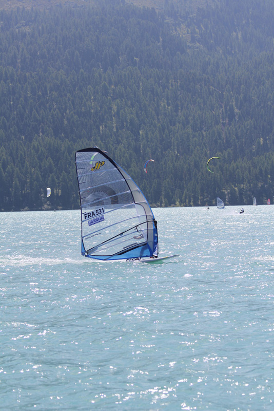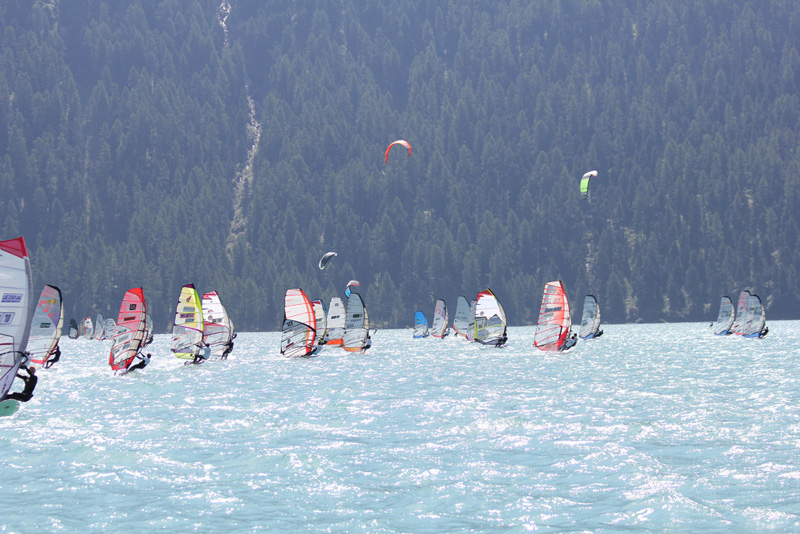 Morgens schon ohne Thermik ordentlich Süd-West Strömung das ab 9.00 die ersten Schaumkronen auf dem See waren. Der teilweise vorhergesagte Monstertag würde es nicht, aber Nachmittags wurden bis zu 30knt an der Luvtonne gemessen.