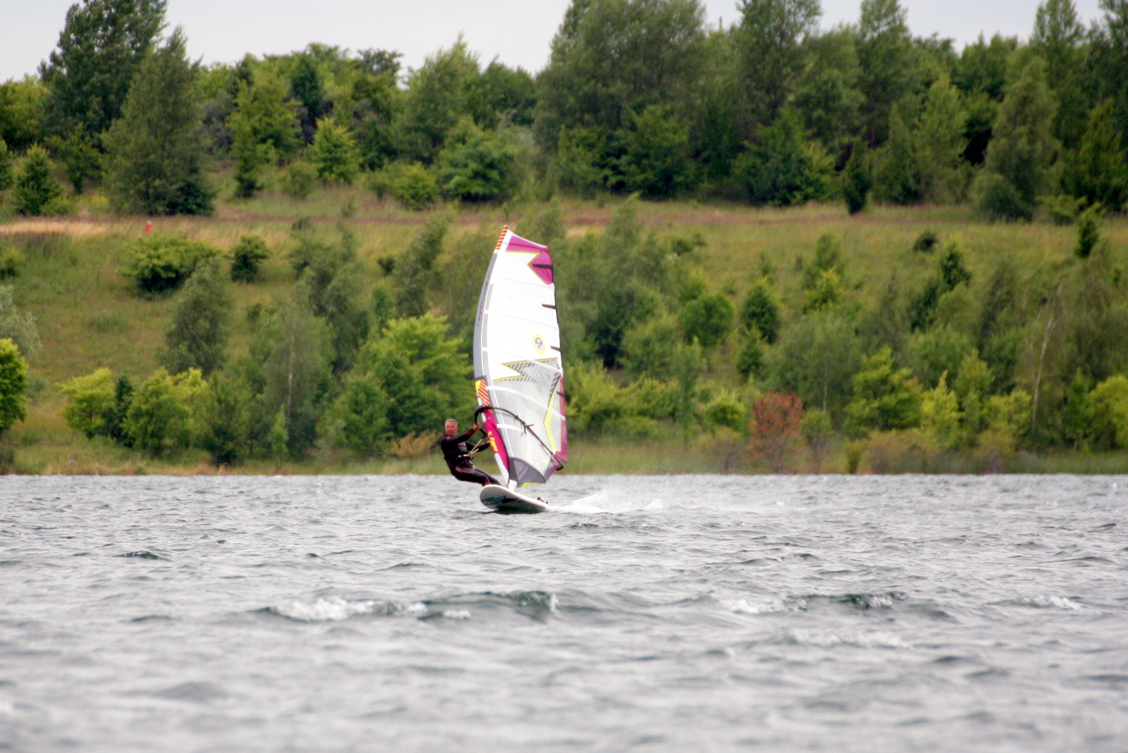 Der frühe Micha surft den Wind des Tages. Bei AllonSea.de waren Surf- und Segelschulung bzw. Wartungsarbeiten angesagt. Der Himmel war grau, aber es war schön warm. Die erste Stunde war ich leider allein unterwegs und schon gut angepowert. Doch als Holo auftauchte hatten wir 14-19 Knoten auf dem See. Andre nutzte zum Schluß auch noch die Böen. Alle anderen hatten scheinbar heute besseres vor - Schade!