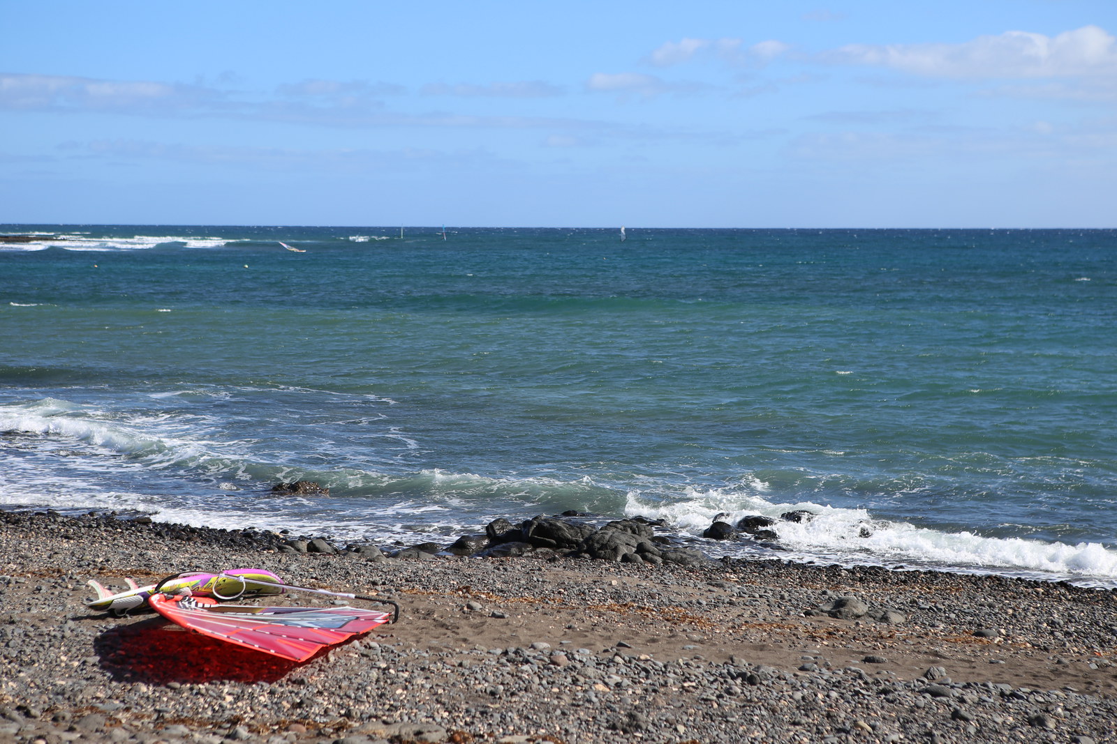 Wind - endlich. Nach vielen windlosen Tagen mit sehr guten Wellen zum wellenreiten gab es heute wieder Wind. Schöne, etwas böige Bedingungen und sehr wenig los auf dem Wasser.